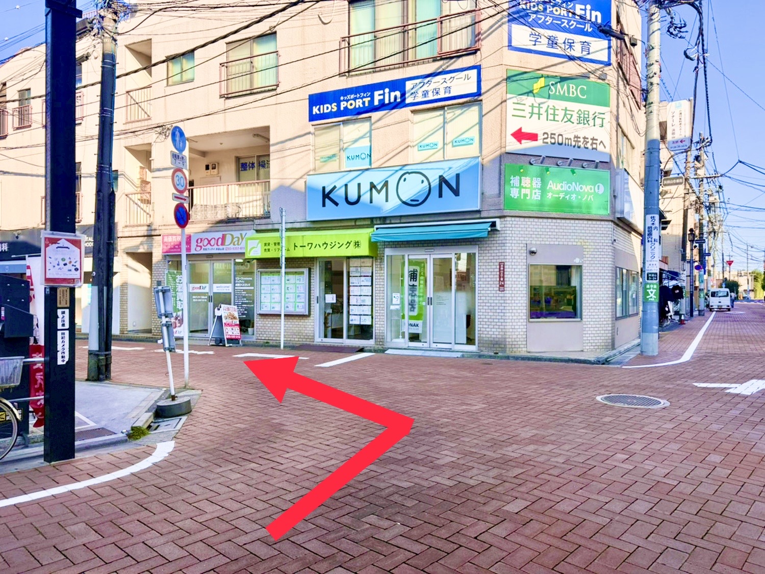 しばらく進むと、KUMONの看板が見えてきますので、手前を左に曲がります。