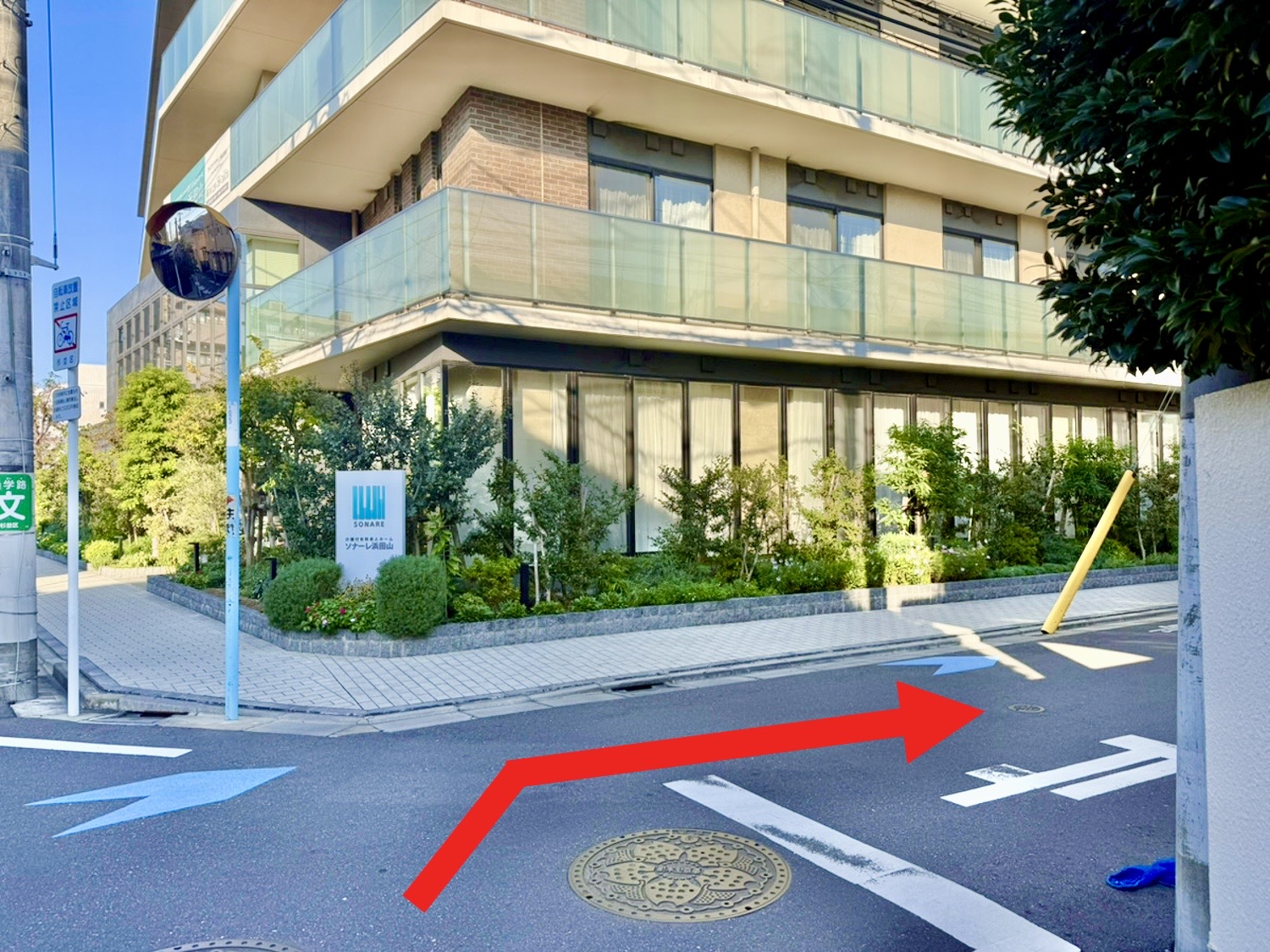 右手に老人ホームのソナーレ浜田山が見えてきますので、手前を右に曲がります。