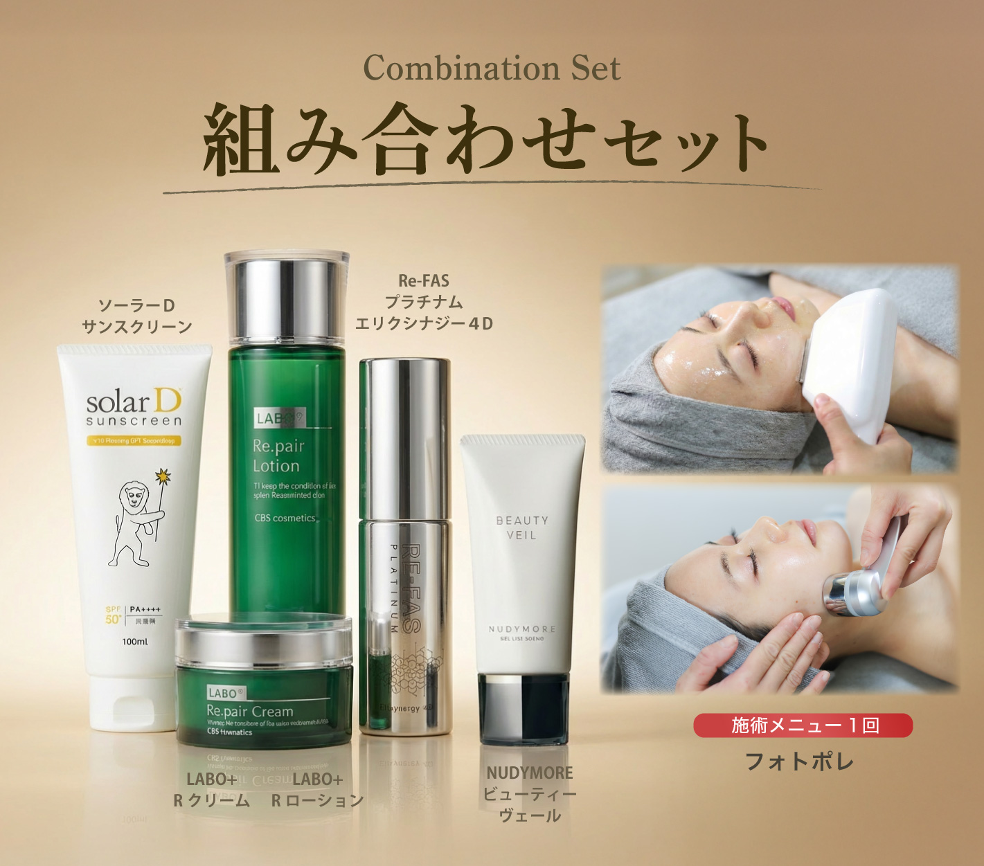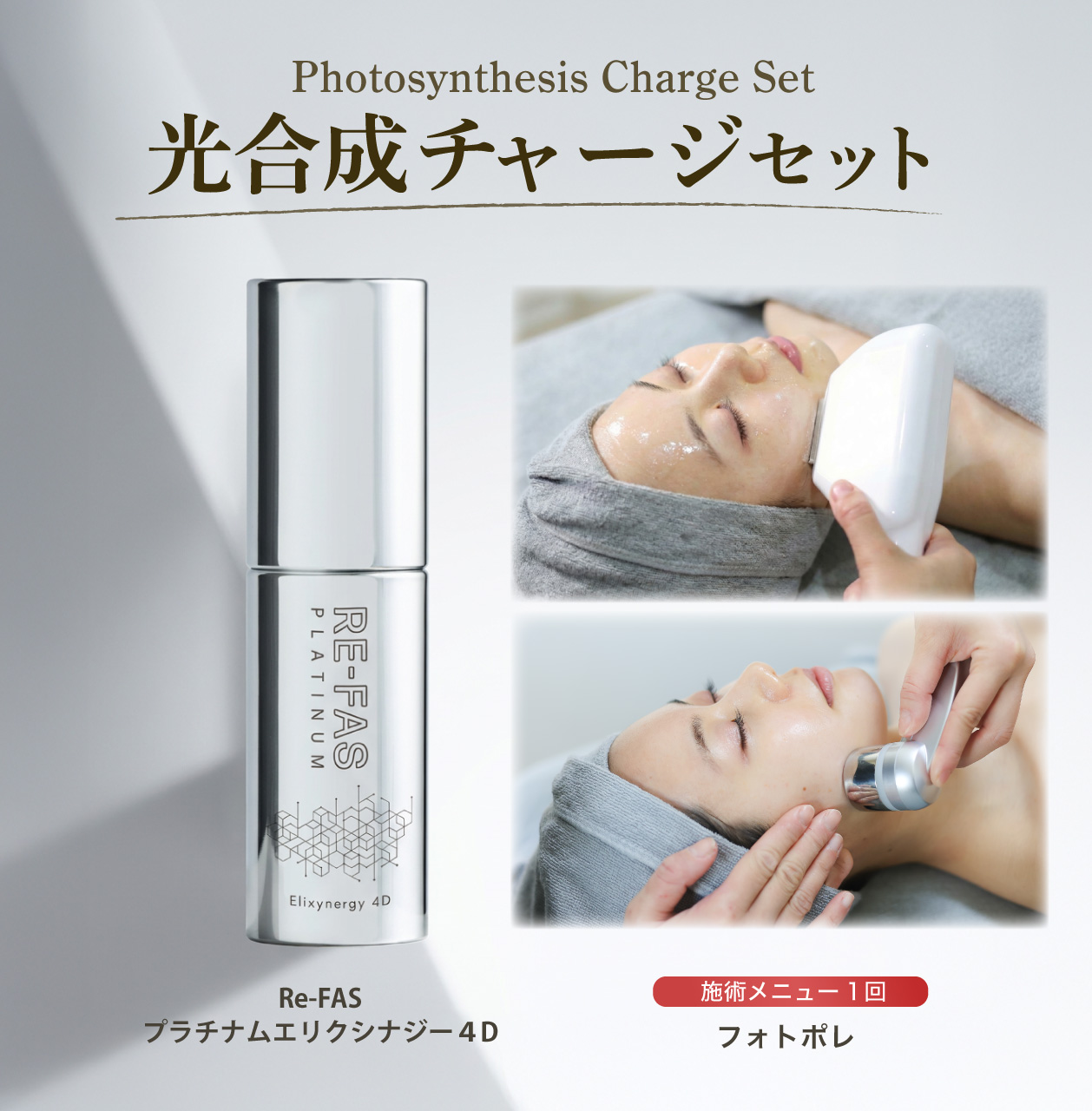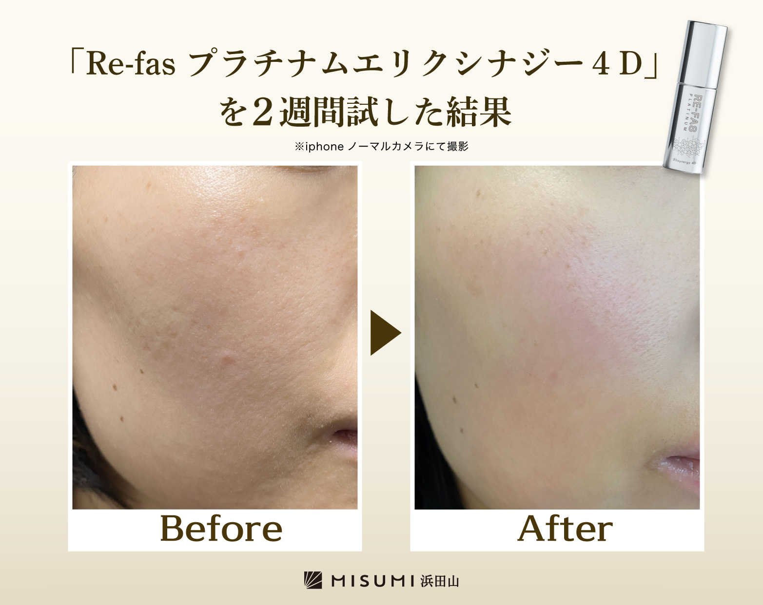 フォトポレで“今の肌”を引き上げ、家では 新発売の「顔特化型」美容液 Re-FAS プラチナム エリクシナジー4Dで、施術後の状態を 毎日のケアで崩さない 流れを作ります。