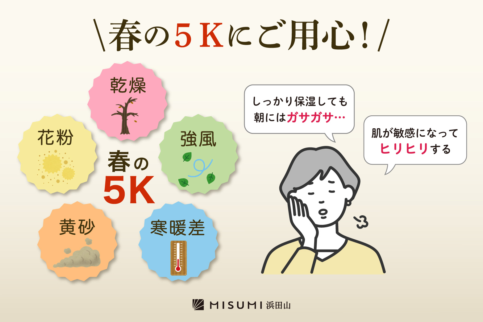 特に3月は、いわゆる「春の5K(花粉・黄砂・乾燥・気温差・紫外線)」が重なり、肌がゆらぎやすくなります。