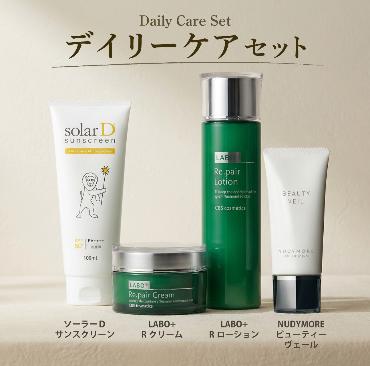 このセットは、ローションとクリームで“基本のうるおいと土台”を整えつつ、日中はサンスクリーンで守り、仕上げにビューティーヴェールで肌の見え方まで整える構成。